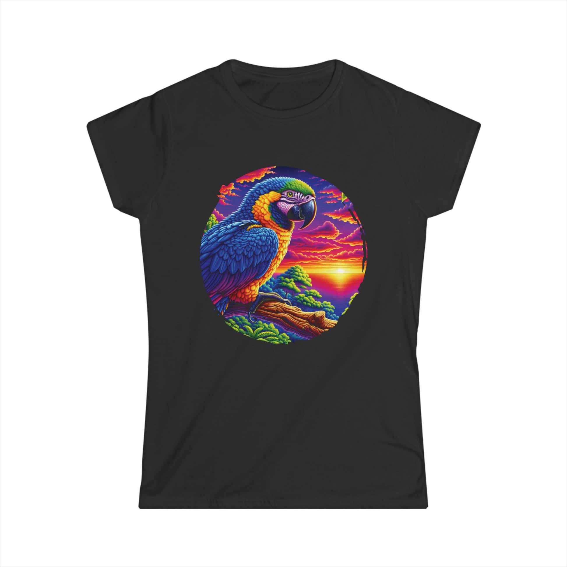 Experience the vibrant spirit of nature with this Women's Softstyle Tee. Featuring a stunning design of a parrot against a breathtaking sunset, this shirt radiates joy and warmth. Perfect for casual outings, beach trips, or simply lounging at home, it brings a touch of tropical paradise to your everyday life. Ideal for nature lovers and bird enthusiasts, this tee makes a wonderful gift for birthdays, holidays, or just as a treat for yourself. Wear it to celebrations, casual gatherings, or while enjoying outdoor activities, and let every moment feel special.