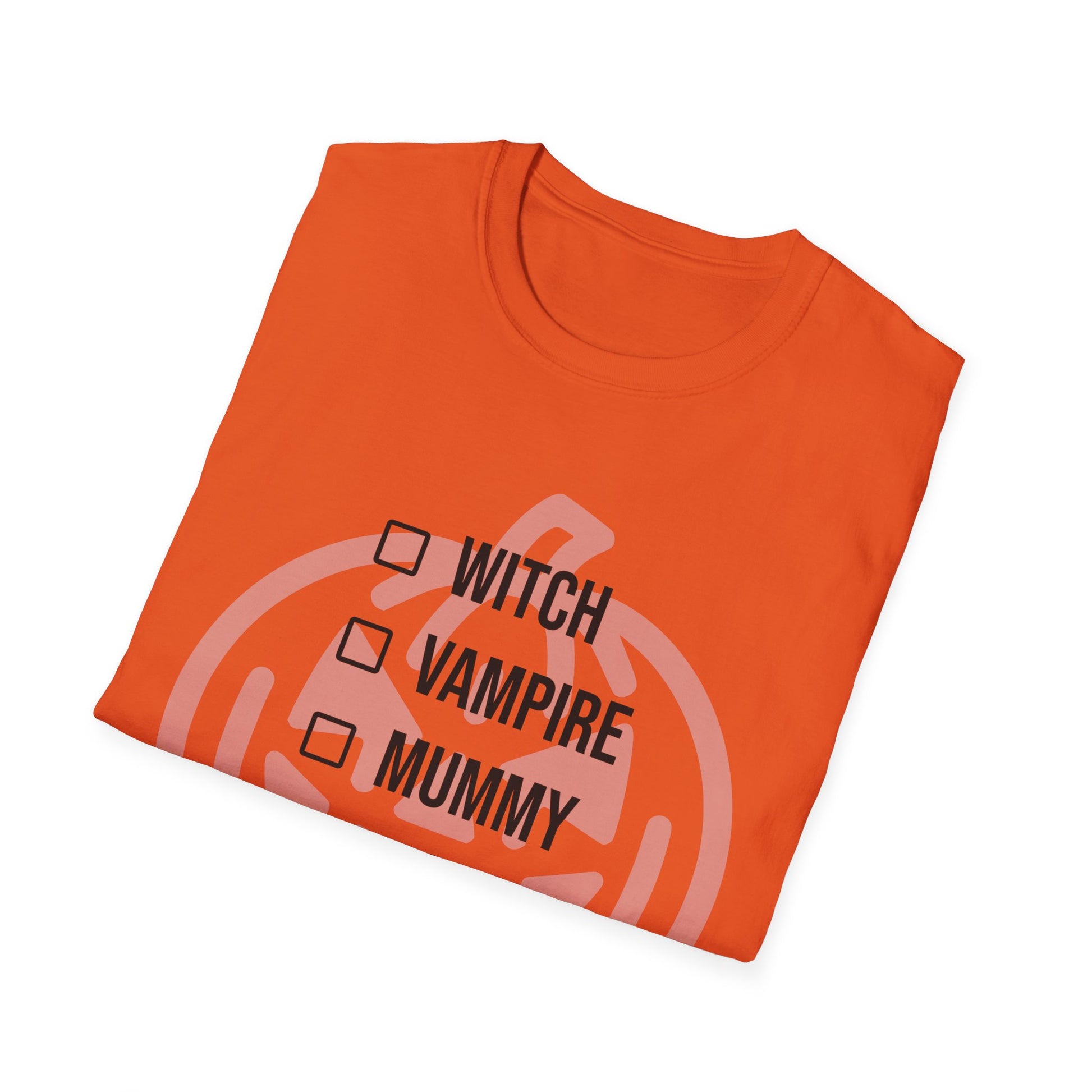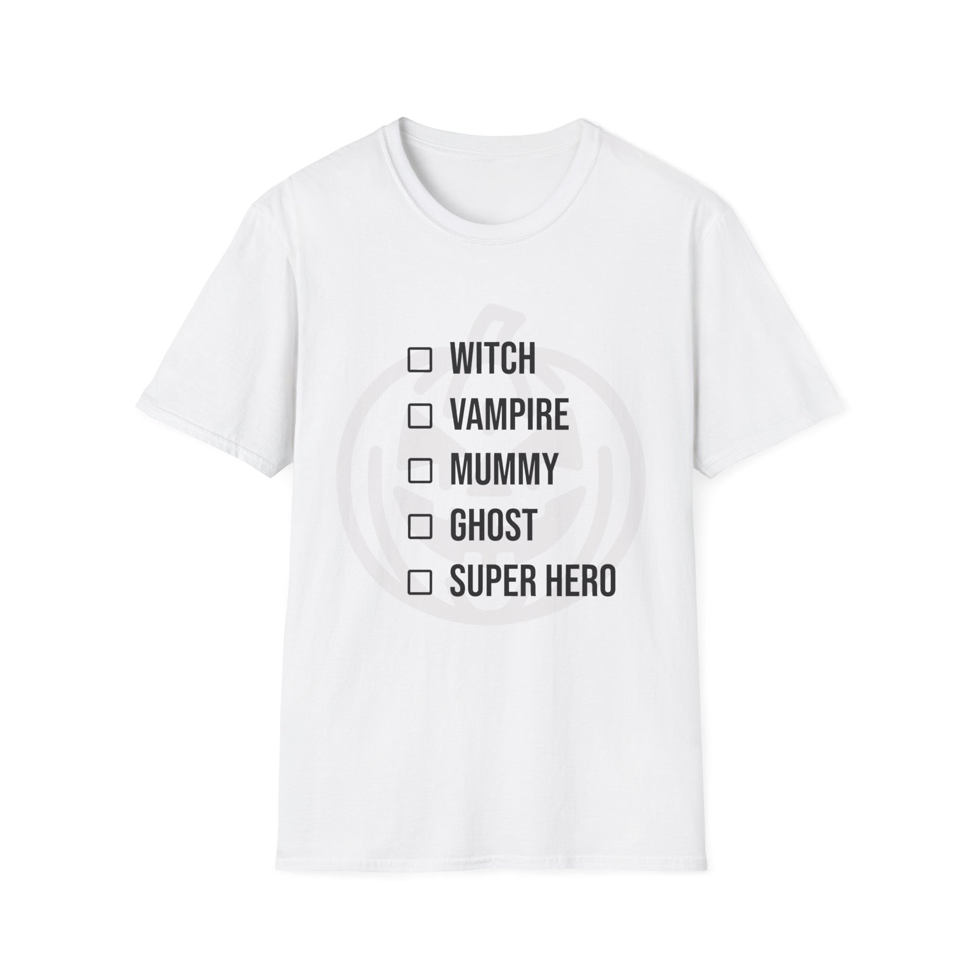 Introducing this stylish Unisex Softstyle T-Shirt, perfect for adding a fun twist to your Halloween wardrobe! With a playful checklist design featuring Halloween favorites like 'Witch,' 'Vampire,' 'Mummy,' 'Ghost,' and 'Super Hero,' this tee sets a festive mood for the spookiest time of the year. Whether you're attending a Halloween party, trick-or-treating with the kids, or just enjoying a laid-back autumn day, this shirt is a versatile addition. Ideal for Halloween enthusiasts of all ages, this tee embraces the spirit of the season while ensuring comfort and style. Layer it under a jacket or wear it solo as the days grow crisp. Perfect for Halloween celebrations, it's a fantastic gift for friends or family who love to get into the holiday spirit!