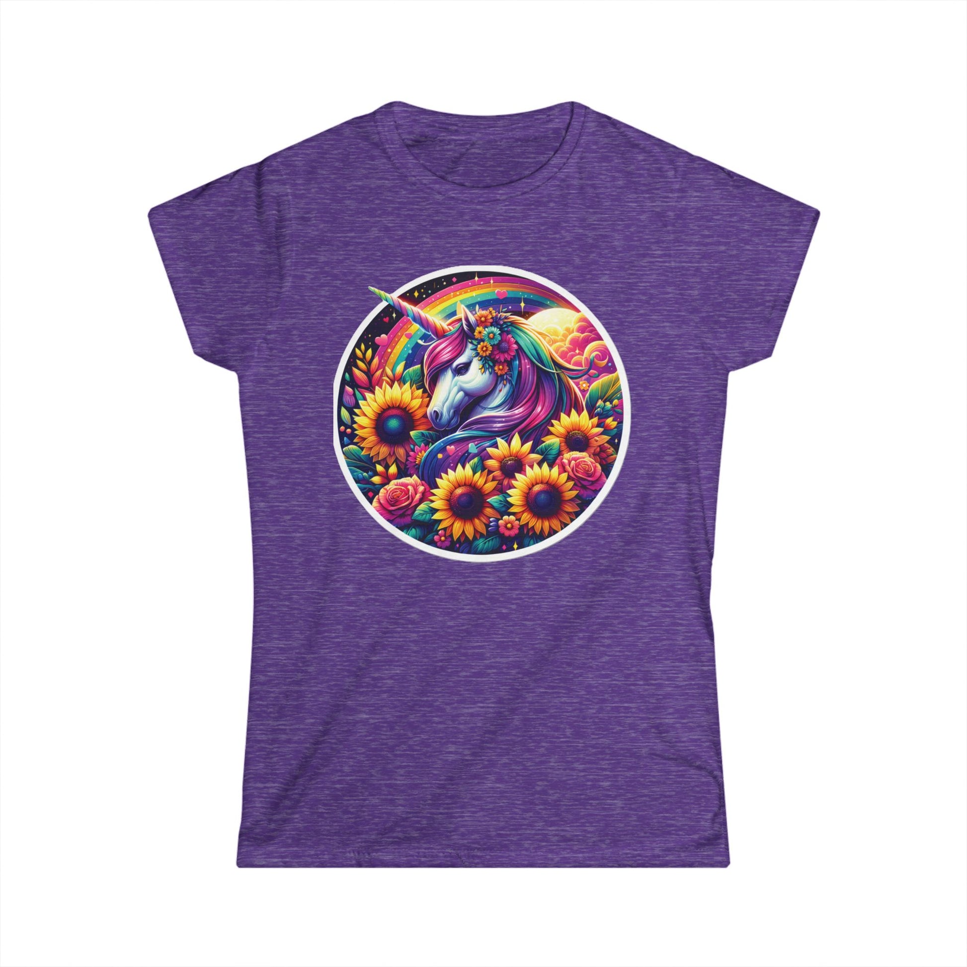 Step into a world of vibrant colors and whimsical charm with our Women's Softstyle Tee. Adorned with a stunning illustration featuring a majestic unicorn surrounded by radiant sunflowers, this tee radiates positivity and joy. Perfect for casual outings, lazy days at home, or as a fun gift, it’s a delightful addition to any wardrobe. Ideal for festival lovers, unicorn enthusiasts, or anyone wanting to express their unique style, this shirt will brighten up your day. Celebrate occasions like birthdays, summer gatherings, or just add a splash of magic to everyday life with this enchanting piece!